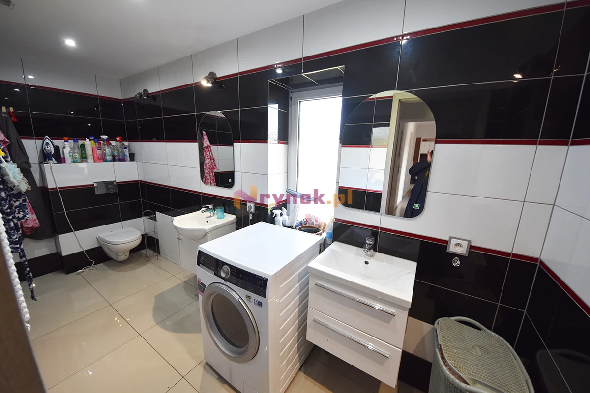 Standard wykończenia bardzo dobry – dom w pełni gotowy do zamieszkania, po generalnym remoncie. Pokoje: podłogi panele, ściany i sufity gładzie, sufity w części domu podwieszane z oświetleniem punktowym. Przedpokoje, łazienki i kuchnia – podłogi w kaflach. Cztery łazienki i ubikacja wykafelkowane (glazury nowego typu), wyposażone w kabiny prysznicowe, wanny, umywalki, lustra i meble łazienkowe. Kuchnia – meble na wymiar wraz z kompletnym sprzętem AGD, na środku wyspa. Nowa stolarka drzwiowa drewniana, okienna PCV (okna dwuszybowe).