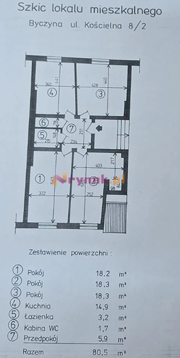 Oferujemy Państwu na Sprzedaż Mieszkanie o powierzchni 80,50 m2 znajdujące się na drugim piętrze w kamienicy w miejscowości Byczyna w samym Centrum. Mieszkanie składa się z trzech pokoi, dużej widnej kuchni, łazienki, osobnej ubikacji oraz przedpokoju. W pokojach, przedpokoju oraz kuchni na podłogach wykładzina pcv, ściany i sufity otynkowane. Łazienka wyposażona w wannę i umywalkę, w osobnej części jest ubikacja i umywalka. Okna PCV, w dwóch oknach rolety zewnętrzne. W mieszkaniu centralne ogrzewanie jest miejskie, ciepła woda - przepływowy podgrzewacz elektryczny, kanalizacja, woda, prąd - miejskie. Do mieszkania przynależy piwnica o pow. 9,7 m2. Nieruchomość posiada duży potencjał aranżacyjny – dzięki lekkim ściankom działowym istnieje możliwość swobodnej przebudowy i dostosowania przestrzeni do własnych potrzeb.